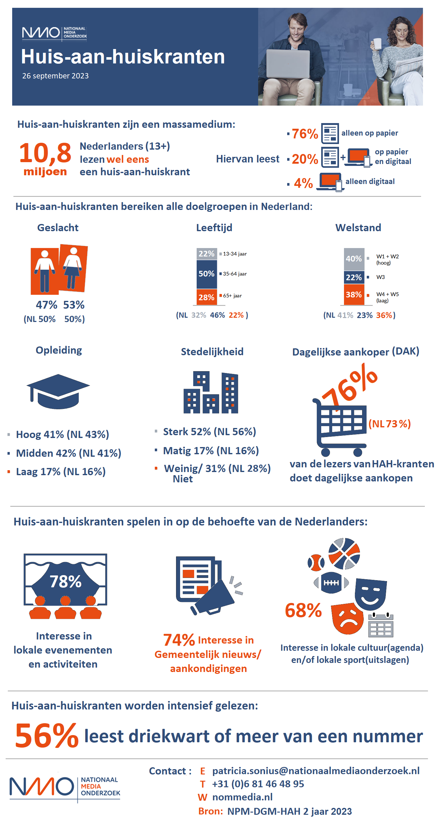 Een keer per jaar worden de bereikscijfers van de huis-aan-huiskranten gepubliceerd. Deze kranten zijn een massamedium: 10,8 miljoen van de Nederlanders van 13 jaar en ouder leest wel eens een huis-aan-huiskrant. Hieronder worden nog enkele andere interessante conclusies uit het onderzoek weergegeven.