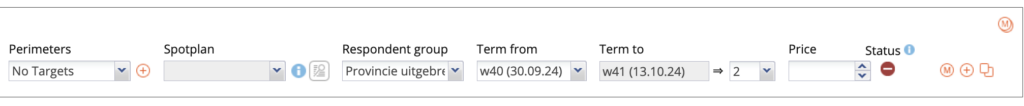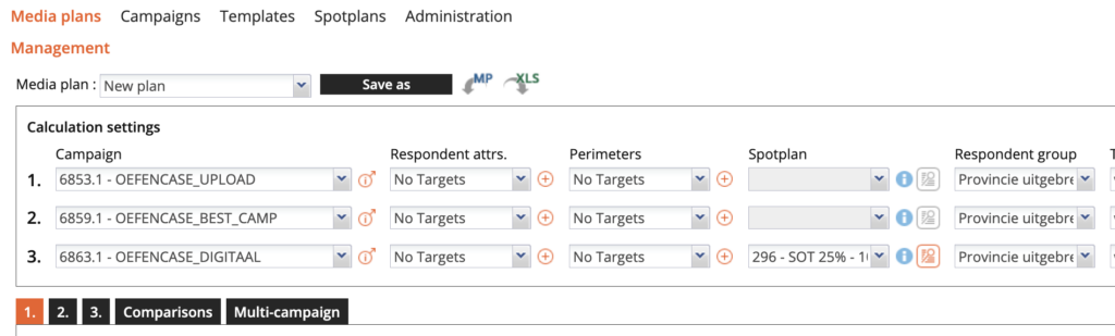 Je kan hier een campagne kiezen, een doelgroep, een perimeter, eventueel een spotplan etc. Feitelijk dezelfde elementen die je ook al eerder hebt gezien bij de ‘Report settings’ onder ‘Campaign/Report.