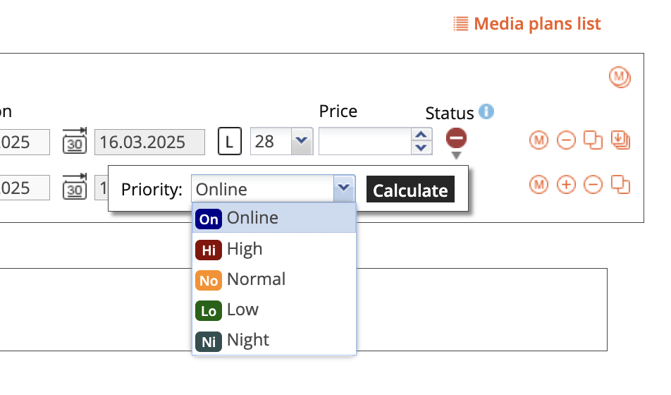 Onder het tabje ‘management’ (rechts van Campaigns) kun je de prioriteit aanpassen en de voortgang monitoren. Eens uitgerekende plannen blijven beschikbaar en kun je altijd zo opvragen. Je herkent al uitgerekende (delen van) een mediaplan aan het groene vinkje onder ‘status’.