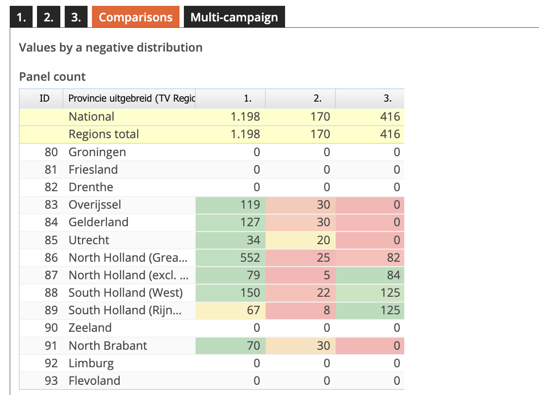Als alle drie de campagnes zijn berekend kun je ‘Comparison’ aanklikken. IDS geeft dan een vergelijking van de drie campagnes op alle mogelijke parameters. In dit voorbeeld laten we ‘Panel count’ zien voor de drie campagnes, maar je kan naar beneden scrollen voor de overige parameters zoals bereik, aantal contacten, VAC en contactfrequentie.
