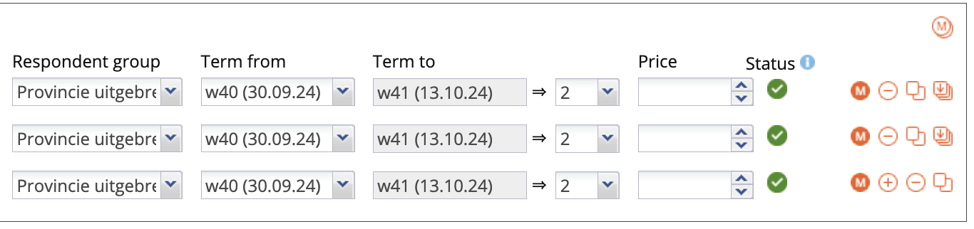 We gaan nu drie campagnes selecteren (maximum is 20) die we al eerder hebben samengesteld. Als je de eerst campagne hebt geselecteerd ga je helemaal naar rechts en klik je op het oranje plusje voor een nieuwe regel of op het kopieer-icoon om de regel te kopieren/klonen. Dat ziet er zo uit: